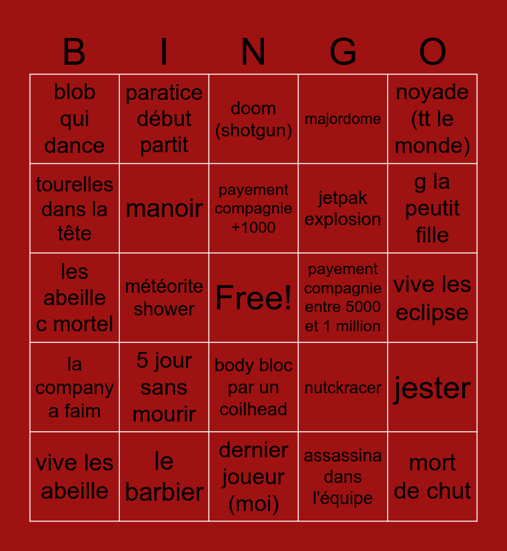 This bingo card has a free space and 50 words: braken, mort de chut, thumper, dernier joueur (moi), 5 jour sans mourir, tout le monde meurt, paratice début partit, mine explosion, tourelles dans la tête, mine (la map), manoir, majordome, jester, nutckracer, free, explosion (cruiser), payement compagnie +1000, payement compagnie entre 5000 et 1 million, robot, noyade (tt le monde), météorite shower, assassina dans l'équipe, blob qui dance, jetpak explosion, le piege a pice tueur, si il y a sette casse relance un bigo car je suis cruel, g la peutit fille, ho un maniteur ..., doom (shotgun), body bloc par un coilhead, yieppe, map uniobject, je vole je tombe, c noel?, le barbier, le gang des yieppe attaque, pk il a mis le masque (tout le monde), jester panique, dance mort, vive les eclipse, mon pote c fait mordre, pk il a ouver la bouteil, il etais a deux doit, g peur, vive les abeille, les abeille c mortel, un squiqsquiq, selfi du geant, la company a faim and spyder attaque.