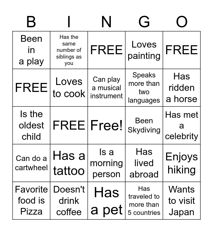 This bingo card has a free space and 24 words: Has a tattoo, Doesn't drink coffee, Can play a musical instrument, Favorite food is Pizza, FREE, Been in a play, FREE, Has the same number of siblings as you, Been Skydiving, Is a morning person, Speaks more than two languages, Is the oldest child, Has lived abroad, Enjoys hiking, Loves to cook, Has traveled to more than 5 countries, Has met a celebrity, FREE, Has ridden a horse, FREE, Wants to visit Japan, Can do a cartwheel, Loves painting and Has a pet.