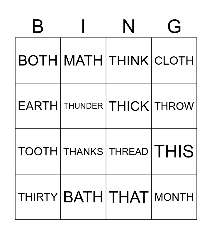 This bingo card has 22 words: THIN, MOTH, THICK, MONTH, BOTH, MATH, THINK, CLOTH, TOOTH, THANKS, THREAD, THROW, THUMB, BATH, THREE, BOOTH, THIRTY, THUNDER, THAT, THIS, EARTH and THING.