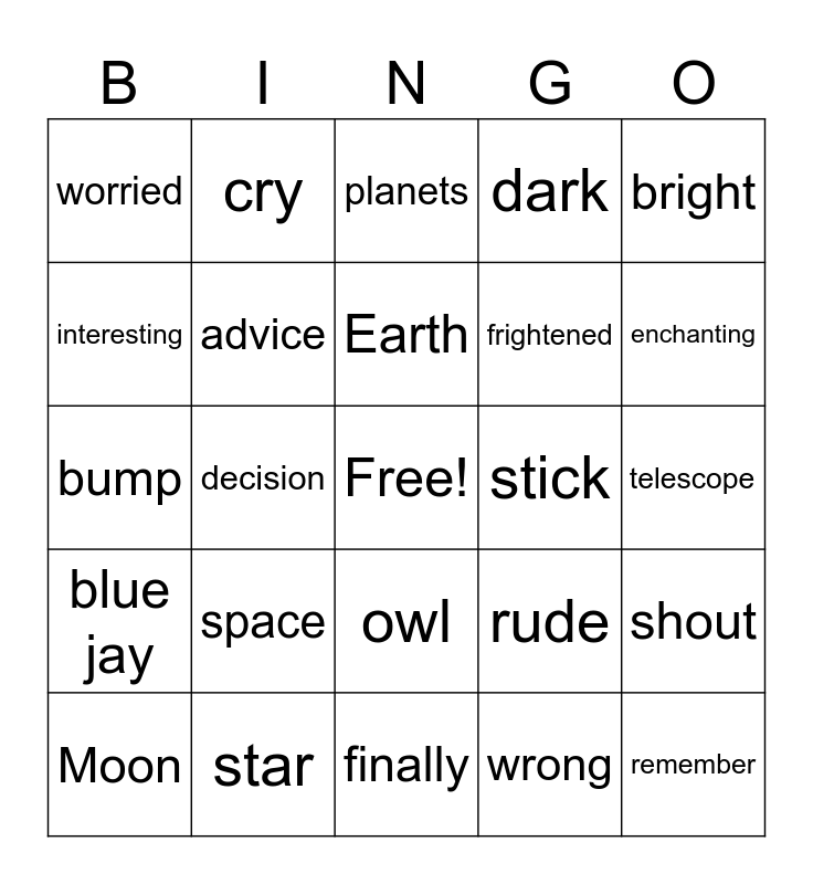 This bingo card has a free space and 24 words: space, star, Earth, Moon, bright, worried, interesting, cry, stick, owl, frightened, bump, rude, shout, advice, wrong, telescope, planets, enchanting, decision, remember, blue jay, dark and finally.