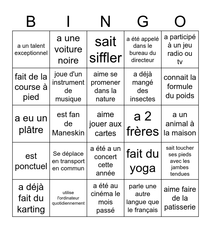This bingo card has a free space and 24 words: Se déplace en transport en commun, utilise l'ordinateur quotidiennement, aime se promener dans la nature, a déjà fait du karting, a participé à un jeu radio ou tv, a un talent exceptionnel, fait de la course à pied, a une voiture noire, a 2 frères, a été a un concert cette année, a déjà mangé des insectes, a eu un plâtre, fait du yoga, sait toucher ses pieds avec les jambes tendues, joue d'un instrument de musique, parle une autre langue que le français, a un animal à la maison, sait siffler, connait la formule du poids, est fan de Maneskin, aime faire de la patisserie, est ponctuel, a été appelé dans le bureau du directeur and a été au cinéma le mois passé.