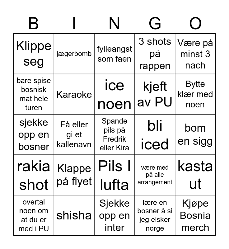 This bingo card has a free space and 24 words: Klappe på flyet, shisha, ice noen, overtal noen om at du er med i PU, Være på minst 3 nach, Klippe seg, bare spise bosnisk mat hele turen, jægerbomb, bli iced, Pils I lufta, kjeft av PU, sjekke opp en bosner, være med på alle arrangement, kasta ut, Karaoke, lære en bosner å si jeg elsker norge, bom en sigg, fylleangst som faen, Bytte klær med noen, Få eller gi et kallenavn, Kjøpe Bosnia merch, rakia shot, 3 shots på rappen and Sjekke opp en inter.