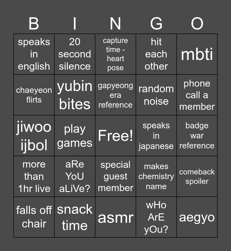 This bingo card has a free space and 24 words: aRe YoU aLiVe?, snack time, gapyeong era reference, falls off chair, mbti, speaks in english, chaeyeon flirts, 20 second silence, speaks in japanese, special guest member, random noise, jiwoo ijbol, makes chemistry name, comeback spoiler, yubin bites, wHo ArE yOu?, badge war reference, capture time - heart pose, phone call a member, play games, aegyo, more than 1hr live, hit each other and asmr.