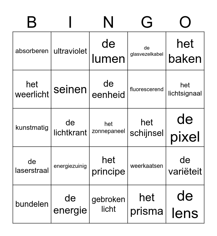 This bingo card has a free space and 24 words: energiezuinig, de energie, de eenheid, bundelen, het baken, absorberen, het weerlicht, ultraviolet, het schijnsel, het principe, fluorescerend, kunstmatig, weerkaatsen, de variëteit, seinen, het prisma, de pixel, de lumen, het lichtsignaal, de lichtkrant, de lens, de laserstraal, de glasvezelkabel and gebroken licht.