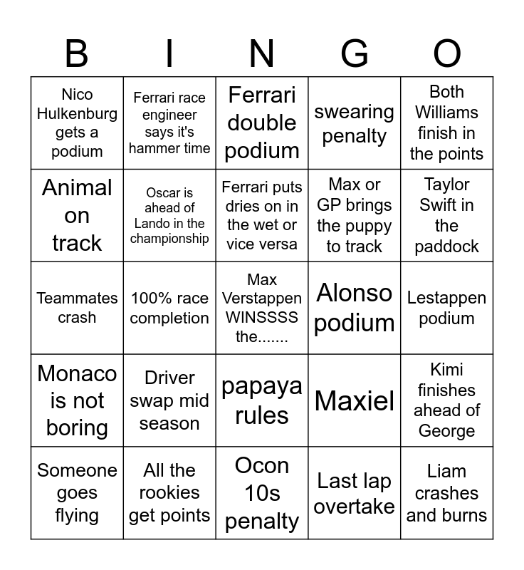 This bingo card has a free space and 24 words: Driver swap mid season, All the rookies get points, Ferrari puts dries on in the wet or vice versa, Someone goes flying, Both Williams finish in the points, Nico Hulkenburg gets a podium, Animal on track, Ferrari race engineer says it's hammer time, Alonso podium, papaya rules, Max or GP brings the puppy to track, Teammates crash, Maxiel, Kimi finishes ahead of George, Oscar is ahead of Lando in the championship, Last lap overtake, Lestappen podium, Ferrari double podium, Taylor Swift in the paddock, 100% race completion, Liam crashes and burns, Monaco is not boring, swearing penalty and Ocon 10s penalty.