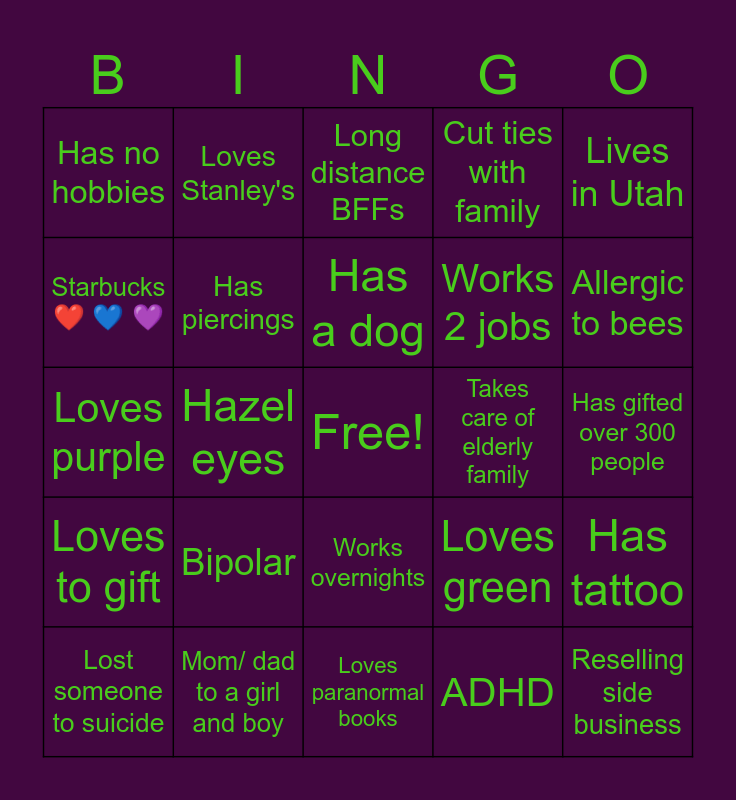 This bingo card has a free space and 24 words: Bipolar, Mom/ dad to a girl and boy, Has a dog, Lost someone to suicide, Lives in Utah, Has no hobbies, Starbucks ❤️ 💙 💜, Loves Stanley's, Takes care of elderly family, Works overnights, Works 2 jobs, Loves purple, Loves green, Has tattoo, Has piercings, ADHD, Has gifted over 300 people, Long distance BFFs, Allergic to bees, Hazel eyes, Reselling side business, Loves to gift, Cut ties with family and Loves paranormal books.