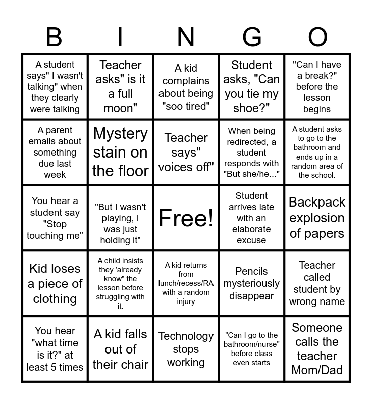 This bingo card has a free space and 29 words: You hear "what time is it?" at least 5 times, They cut in line drama, "But I wasn't playing, I was just holding it", A student spills their milk, A student says" I wasn't talking" when they clearly were talking, A kid complains about being "soo tired", Mystery stain on the floor, A child insists they 'already know" the lesson before struggling with it., Student arrives late with an elaborate excuse, A kid falls out of their chair, Backpack explosion of papers, Someone calls the teacher Mom/Dad, Technology stops working, "Can I go to the bathroom/nurse" before class even starts, A student asks to go to the bathroom and ends up in a random area of the school., Teacher says "I'll wait", A kid returns from lunch/recess/RA with a random injury, Kid loses a piece of clothing, "Can I have a break?" before the lesson begins, You hear a student say "Stop touching me", Pencils mysteriously disappear, A kid tries to pack up 20 minutes early, When being redirected, a student responds with "But she/he...", A parent emails about something due last week, Student asks, "Can you tie my shoe?", Teacher asks" is it a full moon", Teacher called student by wrong name, Teacher says" voices off" and Student asks,"Can I take a walk?".