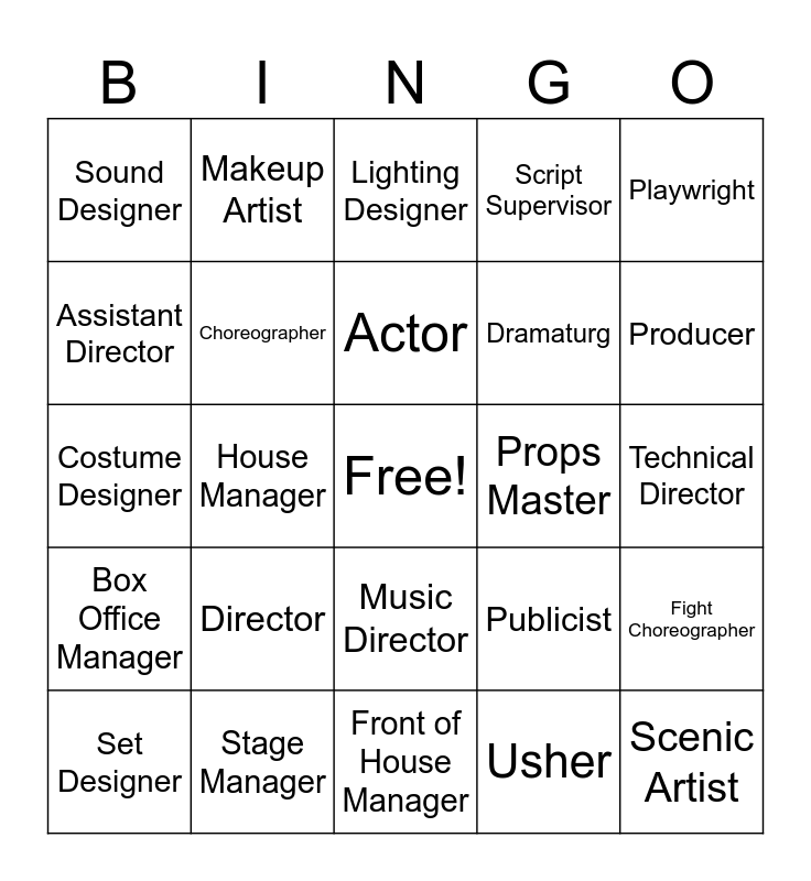 This bingo card has a free space and 24 words: Director, Stage Manager, Actor, Set Designer, Playwright, Sound Designer, Assistant Director, Makeup Artist, Props Master, Music Director, Dramaturg, Costume Designer, Publicist, Fight Choreographer, Choreographer, Usher, Technical Director, Lighting Designer, Producer, House Manager, Scenic Artist, Box Office Manager, Script Supervisor and Front of House Manager.