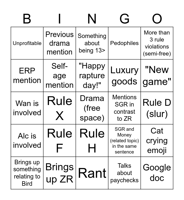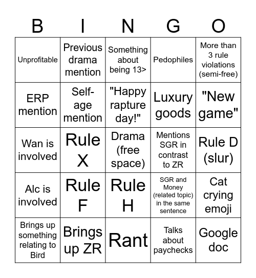 This bingo card has a free space and 24 words: Rule F, Brings up ZR, "Happy rapture day!", Brings up something relating to Bird, More than 3 rule violations (semi-free), Unprofitable, ERP mention, Previous drama mention, Mentions SGR in contrast to ZR, Rule H, Luxury goods, Wan is involved, SGR and Money (related topic) in the same sentence, Cat crying emoji, Self-age mention, Talks about paychecks, Rule D (slur), Something about being 13>, "New game", Rule X, Google doc, Alc is involved, Pedophiles and Rant.