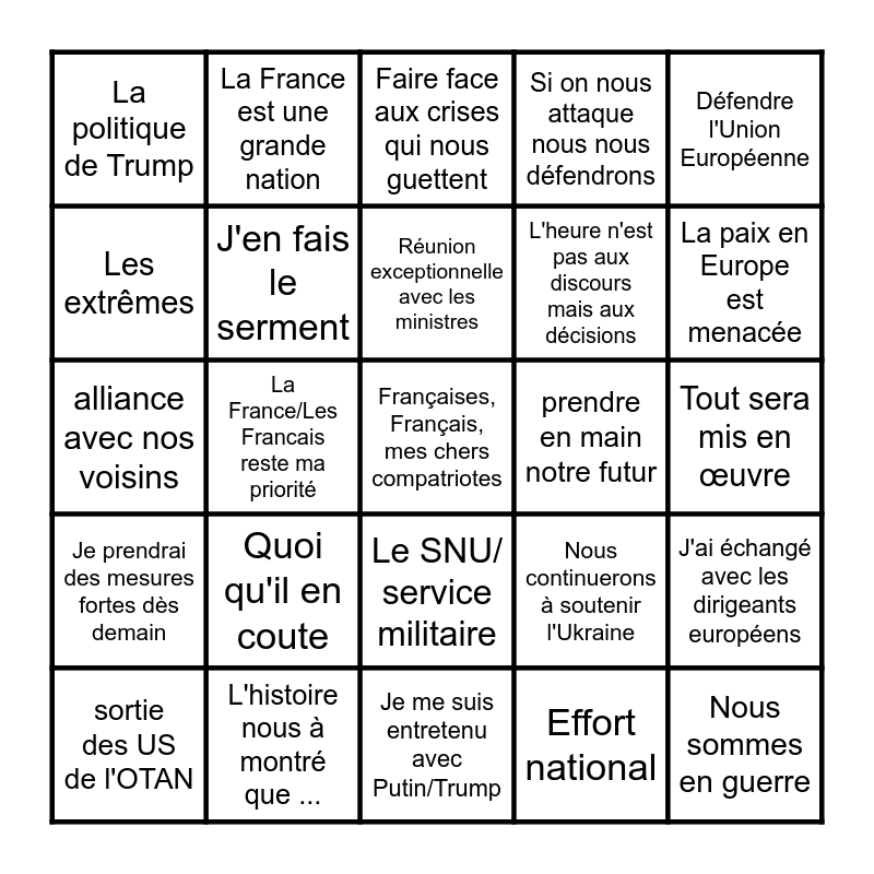 This bingo card has a free space and 24 words: Quoi qu'il en coute, L'histoire nous à montré que ..., Réunion exceptionnelle avec les ministres, sortie des US de l'OTAN, Défendre l'Union Européenne, La politique de Trump, Les extrêmes, La France est une grande nation, prendre en main notre futur, Le SNU/ service militaire, L'heure n'est pas aux discours mais aux décisions, alliance avec nos voisins, Nous continuerons à soutenir l'Ukraine, J'ai échangé avec les dirigeants européens, J'en fais le serment, Effort national, Tout sera mis en œuvre, Faire face aux crises qui nous guettent, La paix en Europe est menacée, La France/Les Francais reste ma priorité, Nous sommes en guerre, Je prendrai des mesures fortes dès demain, Si on nous attaque nous nous défendrons and Je me suis entretenu avec Putin/Trump.