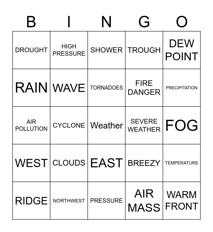 This bingo card has a free space and 46 words: COLD FRONT, WARM FRONT, WIND, PRESSURE, CLOUDS, LOW PRESSURE, HIGH PRESSURE, JET STREAM, RAIN, DRIZZLE, WAVE, TROUGH, TEMPERATURE, BREEZY, GUSTS, THUNDERSTORMS, TORNADOES, SEVERE WEATHER, HUMID, DEW POINT, CYCLONE, AIR MASS, DROUGHT, FIRE DANGER, FAIR, PRECIPITATION, RIDGE, WIND DIRECTION, EAST, WEST, NORTH, SOUTH, SOUTHEAST, SOUTHWEST, NORTHEAST, NORTHWEST, FOG, OVERCAST, SUNNY, CLEAR SKIES, STORMS, SHOWER, AIR POLLUTION, ALTITUDE, OCCLUDED FRONT and STATIONARY FRONT.