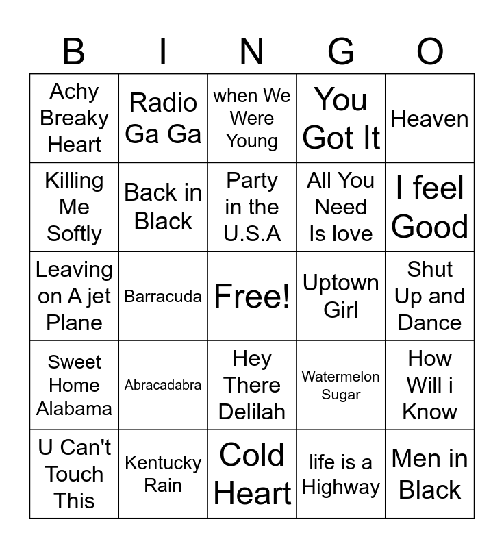 This bingo card has a free space and 24 words: Abracadabra, Kentucky Rain, Party in the U.S.A, U Can't Touch This, Heaven, Achy Breaky Heart, Killing Me Softly, Radio Ga Ga, Uptown Girl, Hey There Delilah, All You Need Is love, Leaving on A jet Plane, Watermelon Sugar, How Will i Know, Back in Black, life is a Highway, Shut Up and Dance, when We Were Young, I feel Good, Barracuda, Men in Black, Sweet Home Alabama, You Got It and Cold Heart.