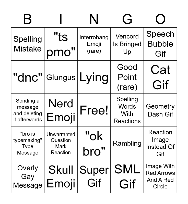 This bingo card has a free space and 24 words: Unwarranted Question Mark Reaction, Skull Emoji, Lying, Overly Gay Message, Speech Bubble Gif, Spelling Mistake, "dnc", "ts pmo", Spelling Words With Reactions, "ok bro", Good Point (rare), Sending a message and deleting it afterwards, Rambling, Reaction Image Instead Of Gif, Glungus, SML Gif, Geometry Dash Gif, Interrobang Emoji (rare), Cat Gif, Nerd Emoji, Image With Red Arrows And A Red Circle, "bro is typemaxing" Type Message, Vencord Is Bringed Up and Super Gif.