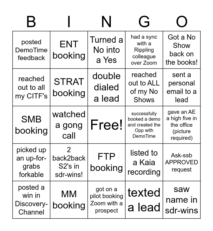 This bingo card has a free space and 24 words: 2 back2back S2's in sdr-wins!, MM booking, double dialed a lead, posted a win in Discovery-Channel, Got a No Show back on the books!, posted DemoTime feedback, reached out to all my CITF's, ENT booking, successfully booked a demo and created the Opp with DemoTime, FTP booking, reached out to ALL of my No Shows, SMB booking, listed to a Kaia recording, Ask-ssb APPROVED request, STRAT booking, texted a lead, gave an AE a high five in the office (picture required), Turned a No into a Yes, sent a personal email to a lead, watched a gong call, saw name in sdr-wins, picked up an up-for-grabs forkable, had a sync with a Rippling colleague over Zoom and got on a pilot booking Zoom with a prospect.