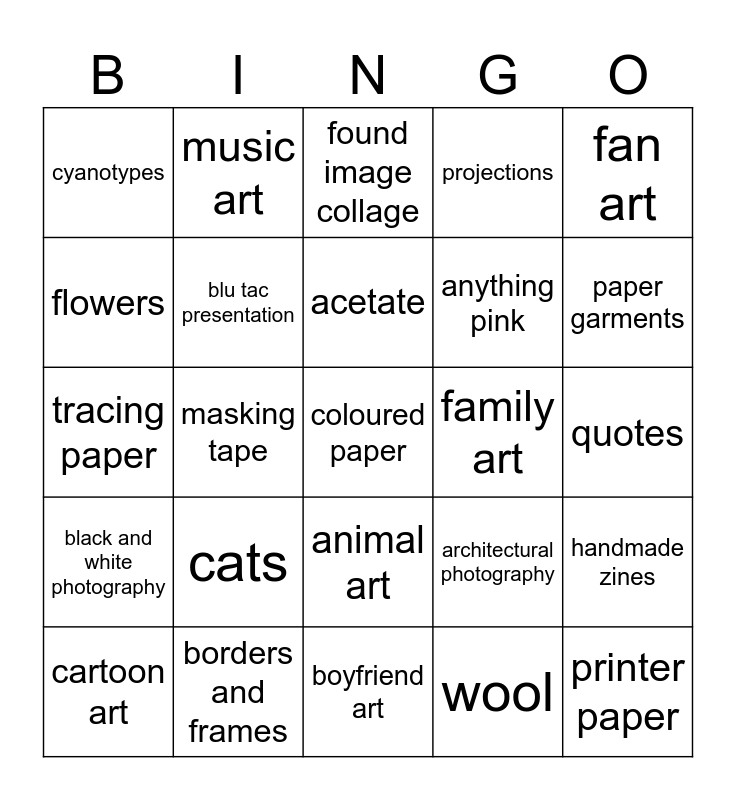 This bingo card has 25 words: cats, boyfriend art, acetate, cartoon art, fan art, cyanotypes, flowers, music art, family art, animal art, anything pink, tracing paper, architectural photography, handmade zines, blu tac presentation, printer paper, quotes, found image collage, paper garments, masking tape, coloured paper, borders and frames, black and white photography, projections and wool.