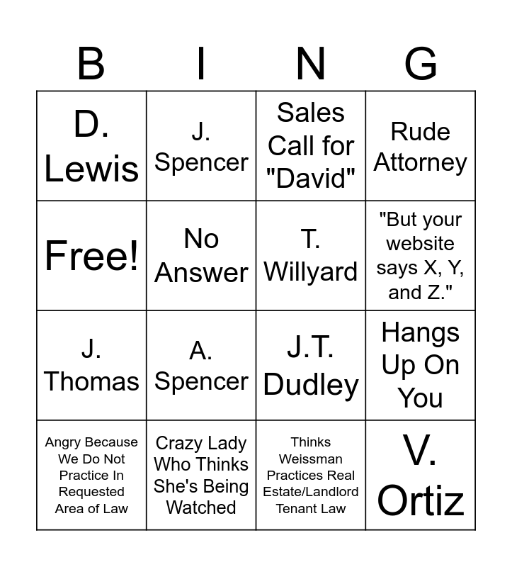 This bingo card has 16 words: Crazy Lady Who Thinks She's Being Watched, Hangs Up On You, Sales Call for "David", D. Lewis, J. Thomas, J. Spencer, J.T. Dudley, Thinks Weissman Practices Real Estate/Landlord Tenant Law, Free!, No Answer, Angry Because We Do Not Practice In Requested Area of Law, Rude Attorney, A. Spencer, "But your website says X, Y, and Z.", T. Willyard and V. Ortiz.