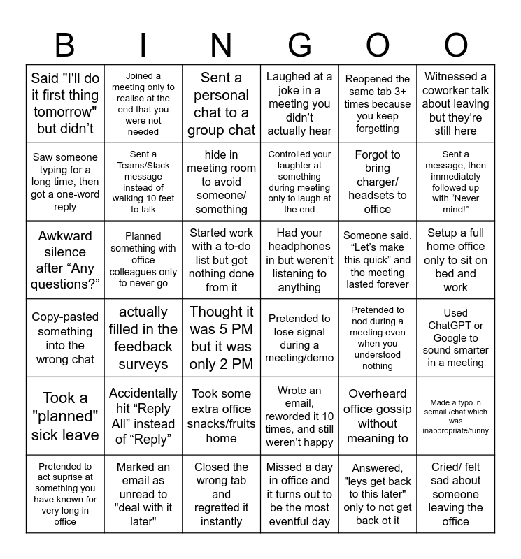 This bingo card has 37 words: Copy-pasted something into the wrong chat, Accidentally hit “Reply All” instead of “Reply”, Closed the wrong tab and regretted it instantly, Laughed at a joke in a meeting you didn’t actually hear, Someone said, “Let’s make this quick” and the meeting lasted forever, Used ChatGPT or Google to sound smarter in a meeting, Said "I'll do it first thing tomorrow" but didn’t, Marked an email as unread to "deal with it later", Started work with a to-do list but got nothing done from it, Wrote an email, reworded it 10 times, and still weren’t happy, Reopened the same tab 3+ times because you keep forgetting, Sent a message, then immediately followed up with “Never mind!”, Saw someone typing for a long time, then got a one-word reply, Sent a Teams/Slack message instead of walking 10 feet to talk, Thought it was 5 PM but it was only 2 PM, Had your headphones in but weren’t listening to anything, Overheard office gossip without meaning to, Witnessed a coworker talk about leaving but they’re still here, Awkward silence after “Any questions?”, Joined a meeting only to realise at the end that you were not needed, Sent a personal chat to a group chat, Controlled your laughter at something during meeting only to laugh at the end, Pretended to nod during a meeting even when you understood nothing, Made a typo in semail /chat which was inappropriate/funny, Took a "planned" sick leave, actually filled in the feedback surveys, hide in meeting room to avoid someone/ something, Missed a day in office and it turns out to be the most eventful day, Answered, "leys get back to this later" only to not get back ot it, Cried/ felt sad about someone leaving the office, Was shocked after hearing that someone is serving notice period/ leaving, Planned something with office colleagues only to never go, Took some extra office snacks/fruits home, Pretended to lose signal during a meeting/demo, Forgot to bring charger/ headsets to office, Setup a full home office only to sit on bed and work and Pretended to act suprise at something you have known for very long in office.