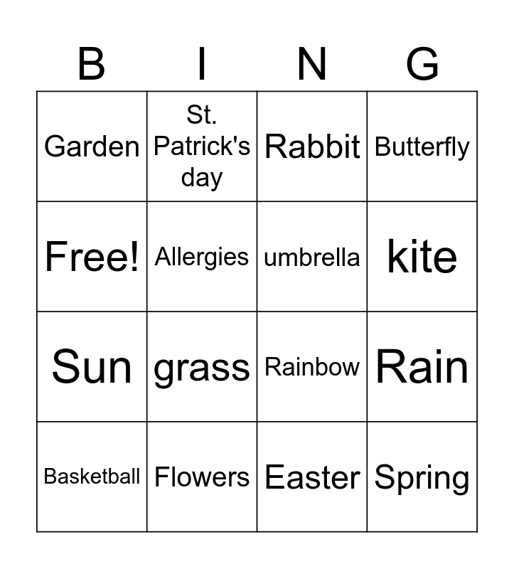 This bingo card has 16 words: Flowers, Rain, Rabbit, Garden, Sun, St. Patrick's day, Rainbow, Easter, Free!, Allergies, Basketball, Butterfly, grass, kite, umbrella and Spring.