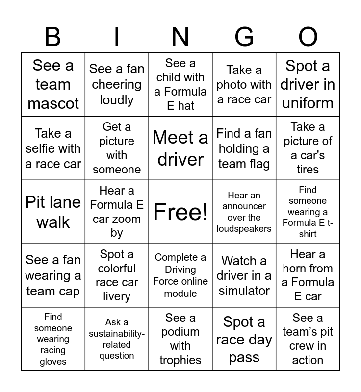 This bingo card has a free space and 40 words: Go on a gaming simulator, Pit lane walk, Ask a motorsport professional a question, Get a picture with someone, Ask a sustainability-related question, Complete a Driving Force online module, Meet a driver, Ask a team member a question, Spot a driver in uniform, See a fan wearing a team cap, Hear a Formula E car zoom by, Take a photo with a race car, See a team’s pit crew in action, Find someone wearing a Formula E t-shirt, Hear an announcer over the loudspeakers, Spot a colorful race car livery, Watch a pit stop in action, See a team mascot, Find someone wearing ear protection, See a child with a Formula E hat, Hear a horn from a Formula E car, Spot a race day pass, Find a fan holding a team flag, Take a selfie with a race car, Spot a celebrity or influencer, See a drone flying above the track, Watch a car drift around a turn, Find a food vendor selling snacks, Hear a drone buzzing overhead, See a recycling station, Spot an open team garage, Find someone wearing racing gloves, See a pit lane full of cars, Watch a driver in a simulator, Take a picture of a car's tires, See a podium with trophies, Find a sponsor's booth, Spot a VIP car, See a fan cheering loudly and Hear the sound of an electric car speeding by.