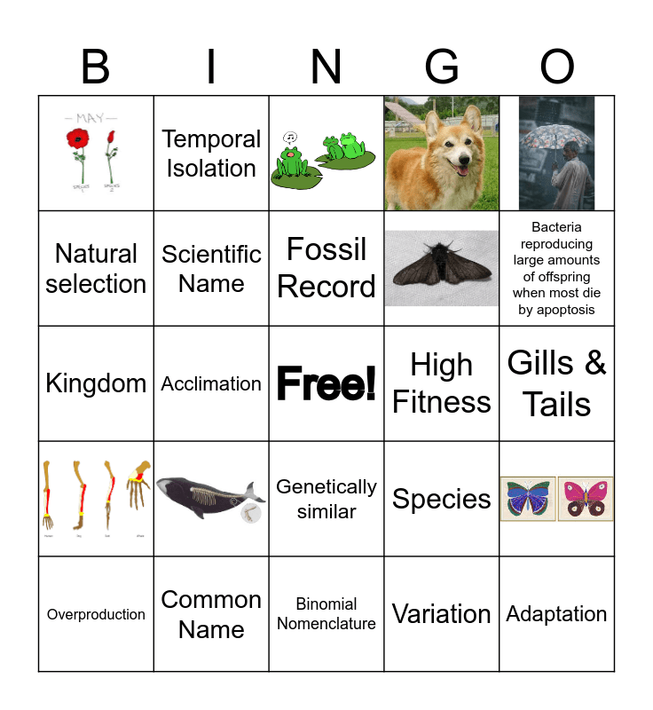This bingo card has 12 images, a free space and 27 words: Low Fitness, Evolution, Domestication, Species, Acclimation, Polar Bear, High Fitness, Gills & Tails, Natural selection, Temporal Isolation, Taxonomy, Bacteria reproducing large amounts of offspring when most die by apoptosis, Kingdom, Genetically similar, Fitness, Overproduction, Scientific Name, Fossil Record, Variation, Common Name, Binomial Nomenclature, Speciation, Inheritance, Different Species, Adaptation, Artificial Selection and Phylogeny.