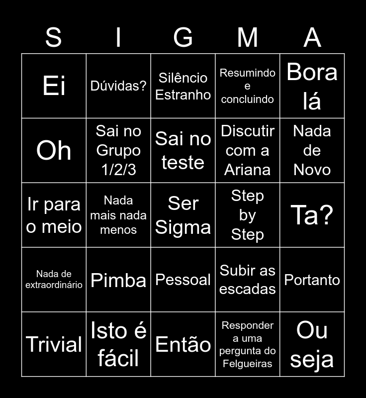 This bingo card has a free space and 24 words: Pimba, Isto é fácil, Sai no teste, Trivial, Bora lá, Ei, Oh, Dúvidas?, Step by Step, Pessoal, Discutir com a Ariana, Ir para o meio, Subir as escadas, Portanto, Sai no Grupo 1/2/3, Responder a uma pergunta do Felgueiras, Ta?, Silêncio Estranho, Nada de Novo, Nada mais nada menos, Ou seja, Nada de extraordinário, Resumindo e concluindo and Então.