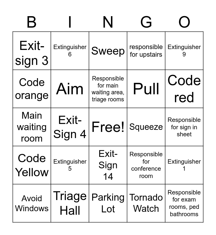 This bingo card has a free space and 24 words: Extinguisher 5, Triage Hall, Responsible for main waiting area, triage rooms, Avoid Windows, Extinguisher 9, Exit-sign 3, Code orange, Extinguisher 6, Squeeze, Exit- Sign 14, Pull, Main waiting room, Responsible for conference room, Extinguisher 1, Aim, Tornado Watch, Responsible for sign in sheet, Sweep, Code red, Exit-Sign 4, Responsible for exam rooms, ped bathrooms, Code Yellow, responsible for upstairs and Parking Lot.