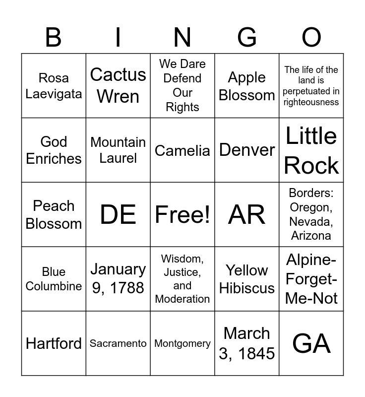 This bingo card has a free space and 29 words: Hartford, Borders: Georgia, Alabama, DE, June 15, 1836, Rosa Laevigata, We Dare Defend Our Rights, Mountain Laurel, January 9, 1788, AR, Sacramento, Borders: Oregon, Nevada, Arizona, GA, Montgomery, March 3, 1845, Little Rock, Juneau, Wisdom, Justice, and Moderation, Blue Columbine, The life of the land is perpetuated in righteousness, Peach Blossom, Yellow Hibiscus, North to the Furture, Denver, God Enriches, Apple Blossom, Cactus Wren, Alpine-Forget-Me-Not, Camelia and AL.