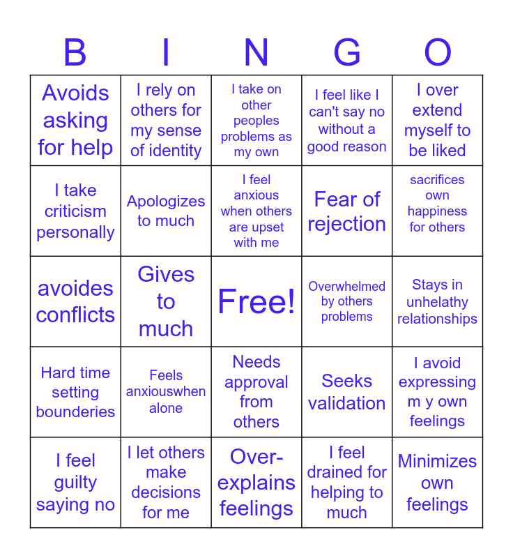 This bingo card has a free space and 29 words: I feel guilty saying no, Fear of abandonment, Gives to much, Feels responsible for others feelings, Avoids asking for help, I take on other peoples problems as my own, Apologizes to much, Feels anxiouswhen alone, Overwhelmed by others problems, I let others make decisions for me, Stays in unhelathy relationships, Minimizes own feelings, Over-explains feelings, I feel drained for helping to much, sacrifices own happiness for others, Struggles with self-worth, Needs approval from others, Hard time setting bounderies, I over extend myself to be liked, avoides conflicts, Seeks validation, Controls to feel secure, Fear of rejection, I take criticism personally, I feel like I can't say no without a good reason, I rely on others for my sense of identity, I avoid expressing m y own feelings, I feel anxious when others are upset with me and I have trouble setting bounderies.