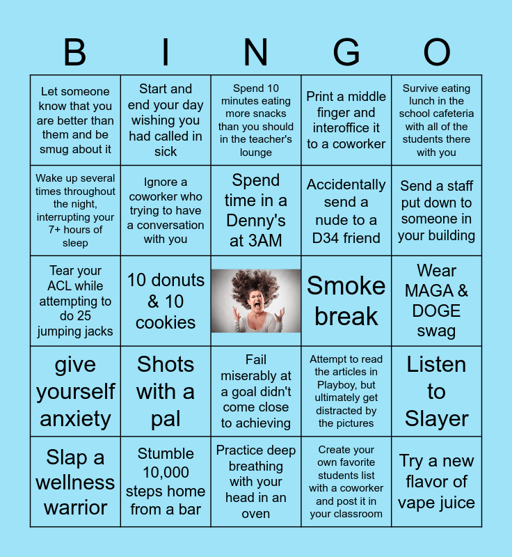 This bingo card has a free space and 24 words: Shots with a pal, Stumble 10,000 steps home from a bar, Spend time in a Denny's at 3AM, Slap a wellness warrior, Survive eating lunch in the school cafeteria with all of the students there with you, Let someone know that you are better than them and be smug about it, Wake up several times throughout the night, interrupting your 7+ hours of sleep, Start and end your day wishing you had called in sick, Smoke break, Fail miserably at a goal didn't come close to achieving, Accidentally send a nude to a D34 friend, Tear your ACL while attempting to do 25 jumping jacks, Attempt to read the articles in Playboy, but ultimately get distracted by the pictures, Listen to Slayer, Ignore a coworker who trying to have a conversation with you, Create your own favorite students list with a coworker and post it in your classroom, Wear MAGA & DOGE swag, Spend 10 minutes eating more snacks than you should in the teacher's lounge, Send a staff put down to someone in your building, 10 donuts & 10 cookies, Try a new flavor of vape juice, give yourself anxiety, Print a middle finger and interoffice it to a coworker and Practice deep breathing with your head in an oven.