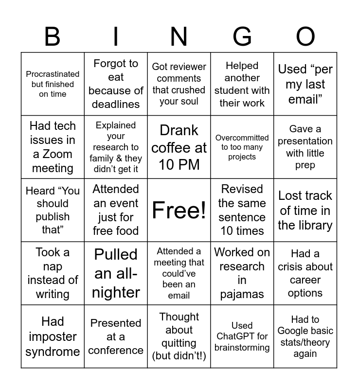 This bingo card has a free space and 24 words: Pulled an all-nighter, Presented at a conference, Drank coffee at 10 PM, Had imposter syndrome, Used “per my last email”, Procrastinated but finished on time, Had tech issues in a Zoom meeting, Forgot to eat because of deadlines, Revised the same sentence 10 times, Attended a meeting that could’ve been an email, Overcommitted to too many projects, Heard “You should publish that”, Worked on research in pajamas, Had a crisis about career options, Explained your research to family & they didn’t get it, Used ChatGPT for brainstorming, Lost track of time in the library, Got reviewer comments that crushed your soul, Gave a presentation with little prep, Attended an event just for free food, Had to Google basic stats/theory again, Took a nap instead of writing, Helped another student with their work and Thought about quitting (but didn’t!).
