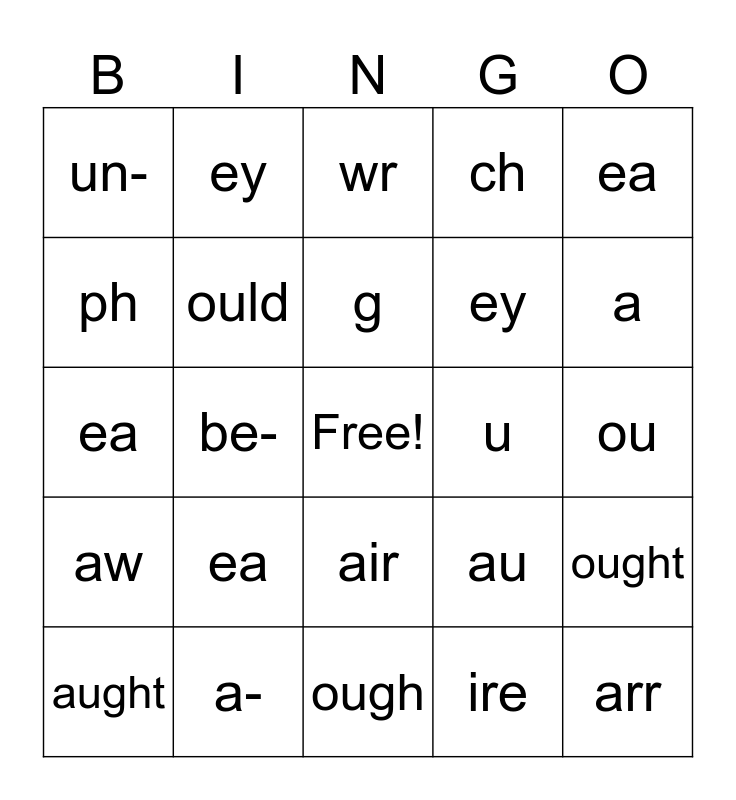 This bingo card has a free space and 30 words: a-, al-, be-, en-, un-, wr, ould, air, u, ough, ou, arr, ire, o, a, c, au, aw, ea, ea, ea, ie, ey, ey, ph, ch, ought, aught, g and dge.
