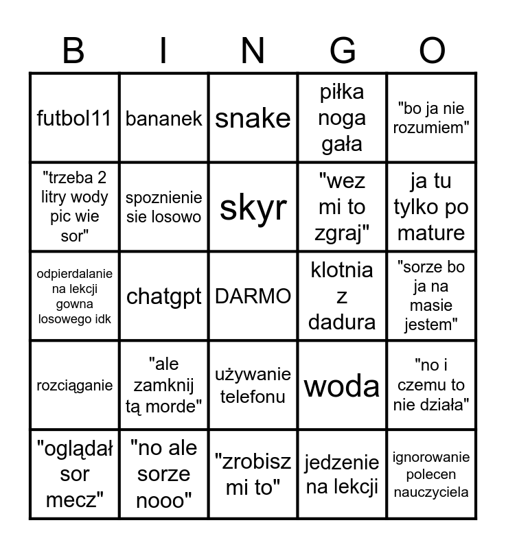 This bingo card has a free space and 24 words: "ale zamknij tą morde", "no ale sorze nooo", skyr, "oglądał sor mecz", "bo ja nie rozumiem", futbol11, "trzeba 2 litry wody pic wie sor", bananek, klotnia z dadura, używanie telefonu, "wez mi to zgraj", odpierdalanie na lekcji gowna losowego idk, woda, "no i czemu to nie działa", spoznienie sie losowo, jedzenie na lekcji, "sorze bo ja na masie jestem", snake, ja tu tylko po mature, chatgpt, ignorowanie polecen nauczyciela, rozciąganie, piłka noga gała and "zrobisz mi to".