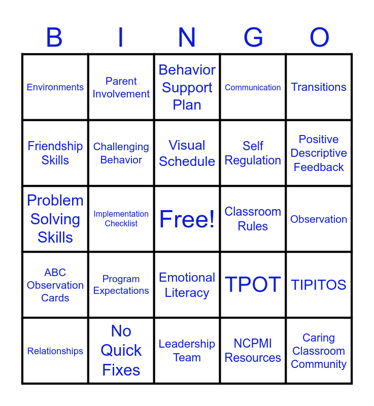 This bingo card has a free space and 24 words: Program Expectations, No Quick Fixes, Visual Schedule, Relationships, Transitions, Environments, Friendship Skills, Parent Involvement, Classroom Rules, Emotional Literacy, Self Regulation, Problem Solving Skills, TPOT, TIPITOS, Challenging Behavior, NCPMI Resources, Observation, Behavior Support Plan, Positive Descriptive Feedback, Implementation Checklist, Caring Classroom Community, ABC Observation Cards, Communication and Leadership Team.