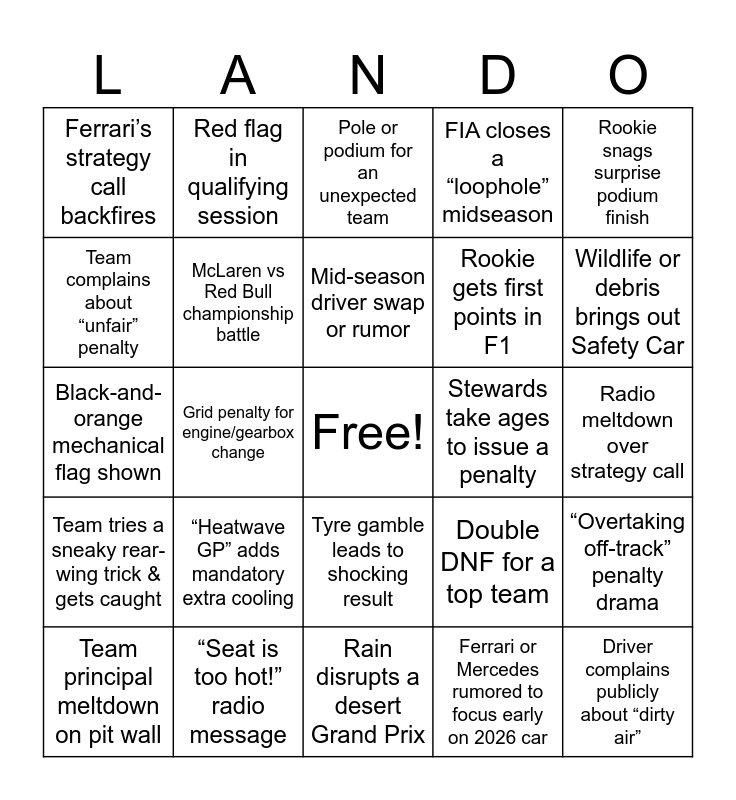 This bingo card has a free space and 25 words: “Heatwave GP” adds mandatory extra cooling, Rain disrupts a desert Grand Prix, Mid-season driver swap or rumor, Team principal meltdown on pit wall, Rookie snags surprise podium finish, Ferrari’s strategy call backfires, Team complains about “unfair” penalty, Red flag in qualifying session, Stewards take ages to issue a penalty, Tyre gamble leads to shocking result, Rookie gets first points in F1, Black-and-orange mechanical flag shown, Double DNF for a top team, “Overtaking off-track” penalty drama, McLaren vs Red Bull championship battle, “Hamilton vs Verstappen” clash, Radio meltdown over strategy call, Pole or podium for an unexpected team, Wildlife or debris brings out Safety Car, Grid penalty for engine/gearbox change, Driver complains publicly about “dirty air”, “Seat is too hot!” radio message, Team tries a sneaky rear-wing trick & gets caught, FIA closes a “loophole” midseason and Ferrari or Mercedes rumored to focus early on 2026 car.