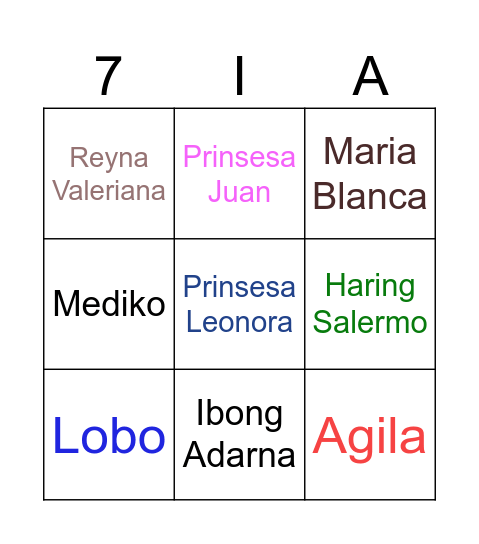 This bingo card has 15 words: Don Juan, Mediko, Maria Blanca, Reyna Valeriana, Ibong Adarna, Prinsesa Leonora, Haring Fernando, Don Pedro, Haring Salermo, Agila, Ermitanyo, Mediko, Lobo, Prinsesa Juan and Don Diego.