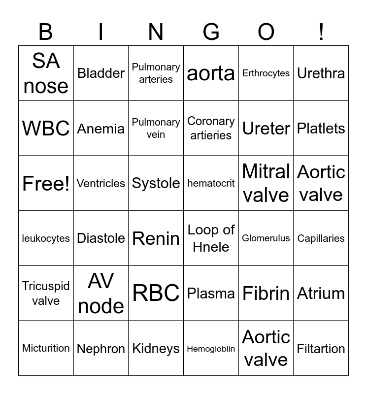 This bingo card has 36 words: Plasma, RBC, Hemogloblin, WBC, leukocytes, hematocrit, Anemia, Kidneys, Erthrocytes, Fibrin, Platlets, aorta, Atrium, Ventricles, Coronary artieries, SA nose, Tricuspid valve, Mitral valve, Free!, Pulmonary arteries, Systole, Diastole, Loop of Hnele, Renin, Glomerulus, Bladder, Ureter, Nephron, Pulmonary vein, Urethra, Filtartion, Micturition, Capillaries, Aortic valve, AV node and Aortic valve.