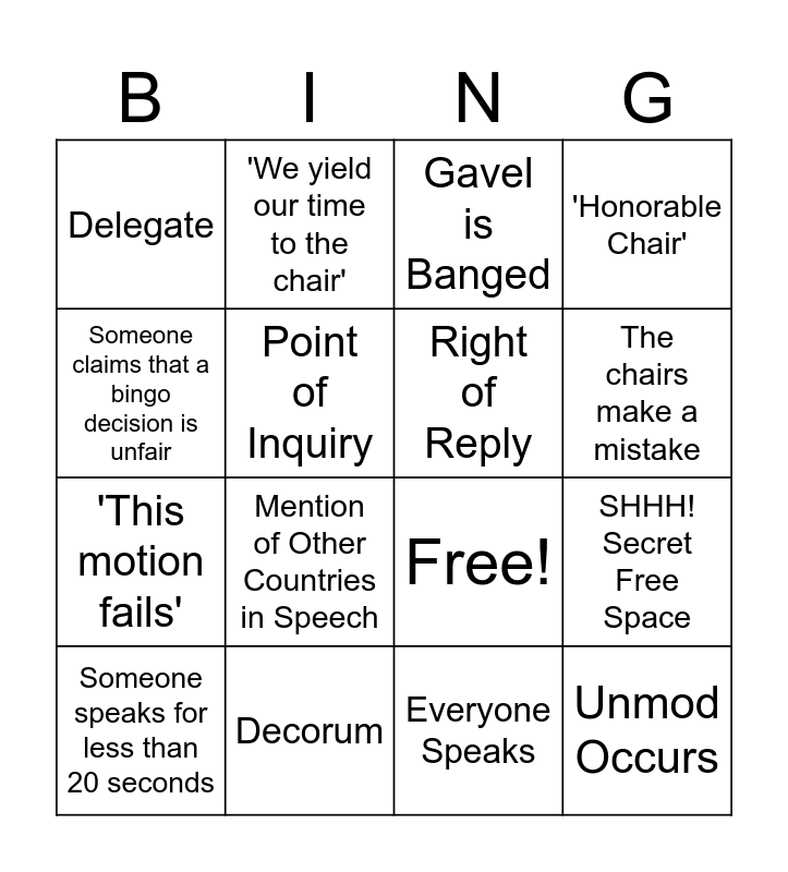 This bingo card has 22 words: Decorum, 'I...', 'We yield our time to the chair', Raising Placard BEFORE Allowed, Point of Inquiry, Right of Reply, Delegate, Gavel is Banged, Free!, Unmod Occurs, 'This motion fails', 'Honorable Chair', Delegate Speaks Overtime, Chairs have to choose someone to speak, Everyone Speaks, 'This motion passes', SHHH! Secret Free Space, Someone speaks for less than 20 seconds, Mention of Other Countries in Speech, Someone claims that a bingo decision is unfair, The chairs make a mistake and Someone goes on their computer.