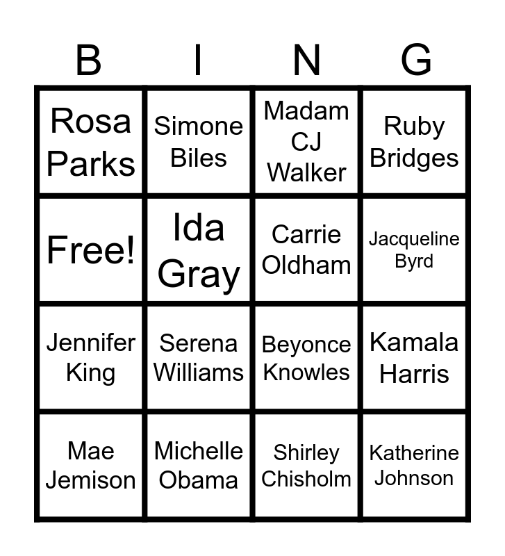 This bingo card has 16 words: Michelle Obama, Kamala Harris, Madam CJ Walker, Rosa Parks, Jennifer King, Simone Biles, Beyonce Knowles, Shirley Chisholm, Free!, Ida Gray, Mae Jemison, Ruby Bridges, Serena Williams, Jacqueline Byrd, Carrie Oldham and Katherine Johnson.