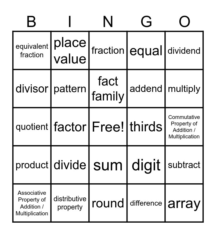 This bingo card has a free space and 24 words: divide, distributive property, fact family, Associative Property of Addition / Multiplication, dividend, equivalent fraction, divisor, place value, thirds, sum, addend, quotient, digit, subtract, pattern, difference, Commutative Property of Addition / Multiplication, fraction, multiply, factor, array, product, equal and round.