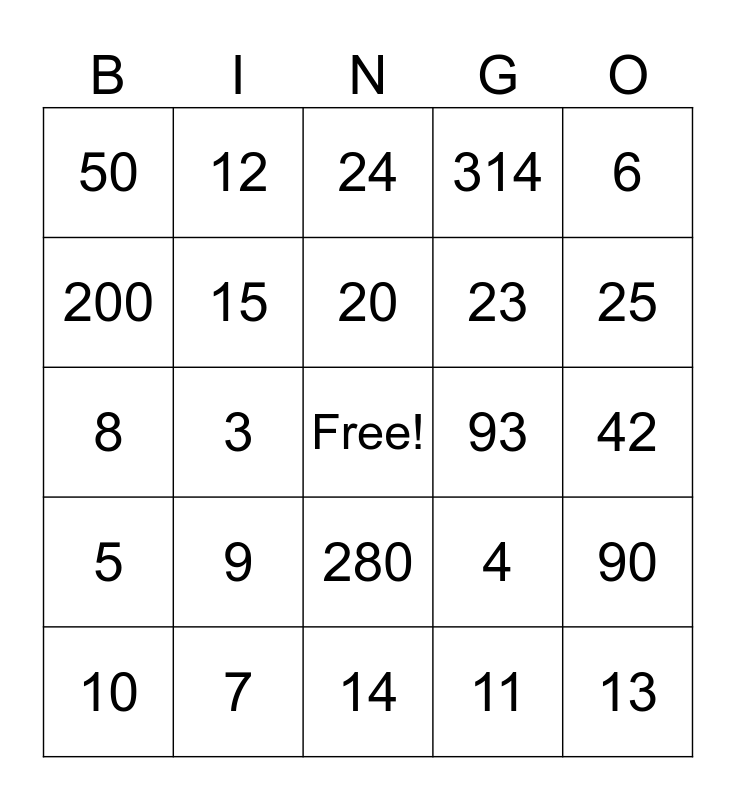 This bingo card has a free space and 24 words: 9, 7, 20, 10, 6, 50, 200, 12, 93, 280, 23, 8, 4, 90, 15, 11, 42, 24, 25, 3, 13, 5, 314 and 14.