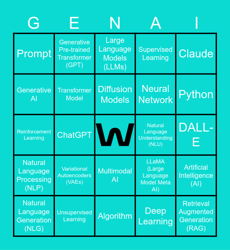 This bingo card has a free space and 28 words: Artificial Intelligence (AI), Machine Learning (ML), Neural Network, Deep Learning, Generative AI, Large Language Models (LLMs), Generative Pre-trained Transformer (GPT), Natural Language Processing (NLP), Natural Language Understanding (NLU), Natural Language Generation (NLG), Reinforcement Learning, Supervised Learning, Unsupervised Learning, Algorithm, Python, Generative Adversarial Networks (GANs), Variational Autoencoders (VAEs), Transformer Model, Diffusion Models, Multimodal AI, Prompt, Context Window, Retrieval Augmented Generation (RAG), ChatGPT, DALL-E, LLaMA (Large Language Model Meta AI), Claude and Copilot.