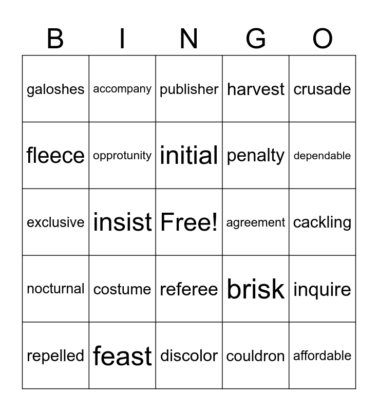 This bingo card has a free space and 33 words: semblance, bushel, insist, enclose, nocturnal, opprotunity, crusade, repelled, accompany, cleats, initial, publisher, maize, gruesome, agreement, dependable, feast, exclusive, costume, brisk, referee, investment, galoshes, cackling, discolor, affordable, harvest, penalty, fleece, inquire, deciduous, couldron and quibbled.