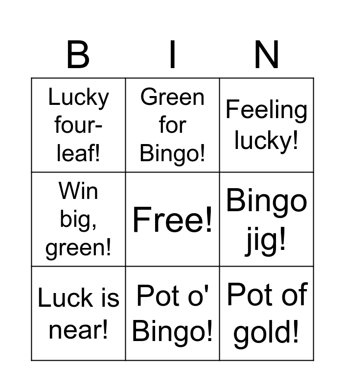 This bingo card has a free space and 16 words: Luck of the Irish!, Shamrock win!, Feeling lucky!, Lucky four-leaf!, Irish eyes win!, Green for Bingo!, Luck's on your side!, Go green!, Pot of gold!, Bingo jig!, Catch the luck!, Win big, green!, Shenanigans!, Pot o' Bingo!, Luck is near! and Leprechaun's win!.
