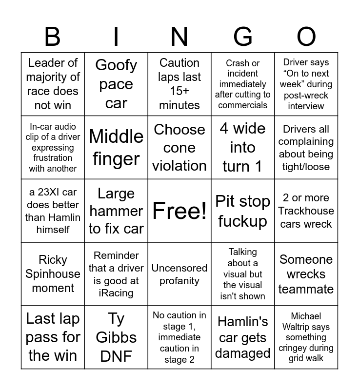 This bingo card has a free space and 39 words: Austin Dillon DNF, Someone refers to Turn 3 as Turn 4, Driver throws something out of window, Middle finger, Last lap pass for the win, Uncensored profanity, Choose cone violation, Random "celebrity", Driver says “On to next week” during post-wreck interview, Ricky Spinhouse moment, Large hammer to fix car, Crash or incident immediately after cutting to commercials, Michael Waltrip says something cringey during grid walk, 2 or more Trackhouse cars wreck, Pit stop fuckup, Reminder that a driver is good at iRacing, Larry McReynolds says "come" in a sentence with an awkwardly long pause afterward, Leader of majority of race does not win, Why is this a camera angle?, Talking about a visual but the visual isn't shown, In-car audio clip of a driver expressing frustration with another, No caution in stage 1, immediate caution in stage 2, 4 wide into turn 1, Drivers all complaining about being tight/loose, Hendrick car has repeated bad luck, Penske car goes from near-last to top 5, Caution leads to overtime, Multi-hour rain delay, Underwhelming "Drivers, start your engines", Goofy pace car, Safety vehicle mishap, Random mid-pack car is top 5 for a while, Caution laps last 15+ minutes, Ty Gibbs DNF, Hamlin's car gets damaged, Ty Dillon DNF, Someone wrecks teammate, a 23XI car does better than Hamlin himself and "Where did he come from?".