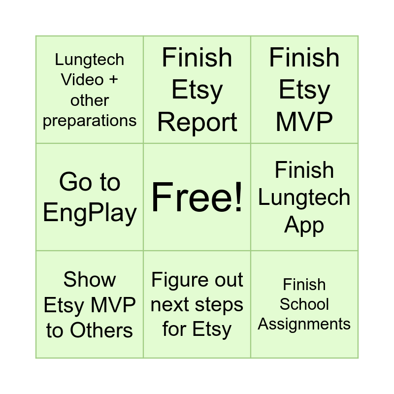 This bingo card has a free space and 8 words: Finish Lungtech App, Finish Etsy MVP, Finish Etsy Report, Show Etsy MVP to Others, Lungtech Video + other preparations, Finish School Assignments, Go to EngPlay and Figure out next steps for Etsy.