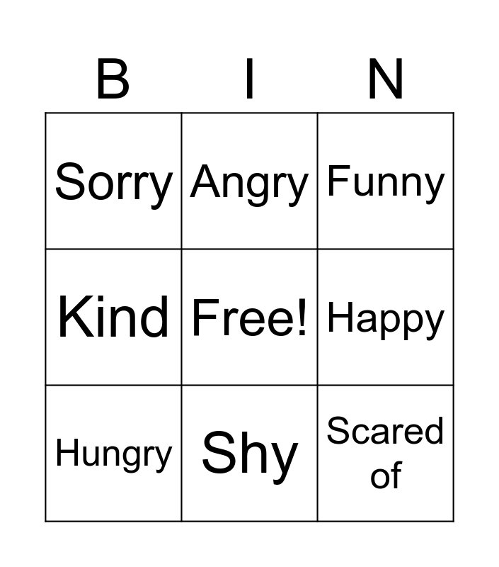 This bingo card has a free space and 8 words: Happy, Funny, Angry, Hungry, Sorry, Scared of, Kind and Shy.
