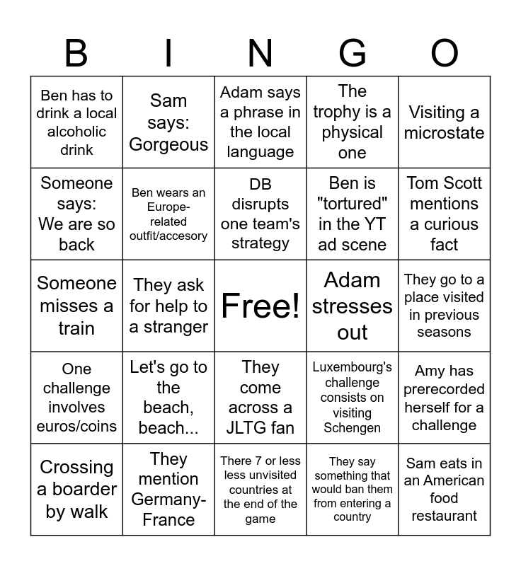 This bingo card has a free space and 24 words: Let's go to the beach, beach..., They mention Germany-France, DB disrupts one team's strategy, Crossing a boarder by walk, Visiting a microstate, Ben has to drink a local alcoholic drink, Someone says: We are so back, Sam says: Gorgeous, Adam stresses out, They come across a JLTG fan, Ben is "tortured" in the YT ad scene, Someone misses a train, Luxembourg's challenge consists on visiting Schengen, Amy has prerecorded herself for a challenge, Ben wears an Europe-related outfit/accesory, They say something that would ban them from entering a country, They go to a place visited in previous seasons, Adam says a phrase in the local language, Tom Scott mentions a curious fact, They ask for help to a stranger, Sam eats in an American food restaurant, One challenge involves euros/coins, The trophy is a physical one and There 7 or less less unvisited countries at the end of the game.