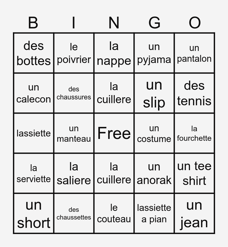 This bingo card has a free space and 24 words: la saliere, des chaussettes, la cuillere, un short, un pantalon, des bottes, un calecon, le poivrier, un costume, la cuillere, un slip, lassiette, un anorak, un tee shirt, des chaussures, lassiette a pian, la fourchette, la nappe, des tennis, un manteau, un jean, la serviette, un pyjama and le couteau.