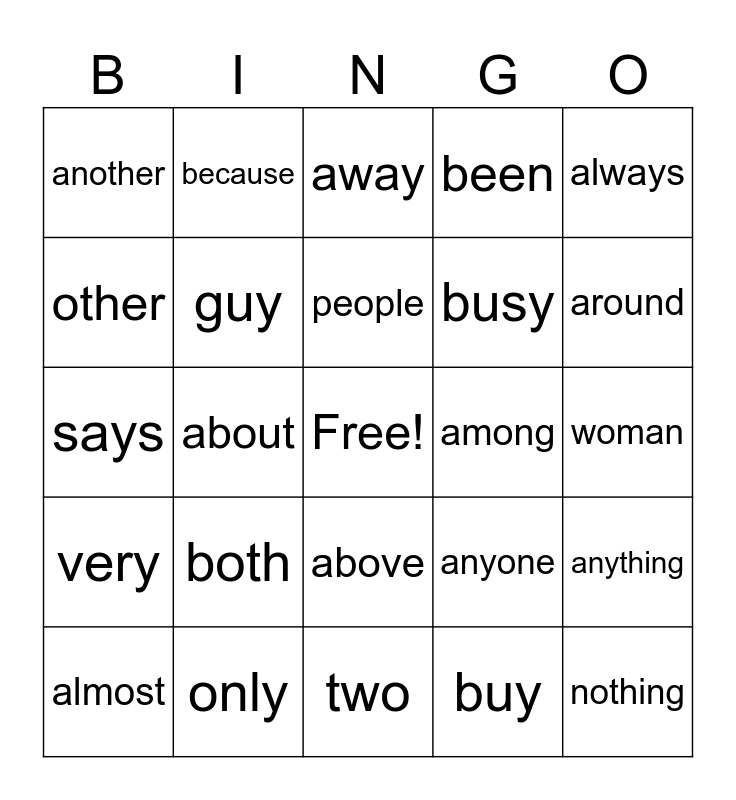 This bingo card has a free space and 24 words: both, only, people, almost, always, another, other, because, among, above, busy, says, anyone, anything, guy, buy, woman, away, around, about, nothing, very, been and two.