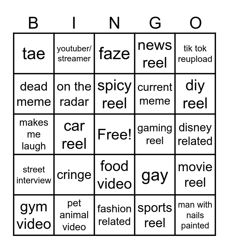 This bingo card has a free space and 24 words: cringe, pet animal video, spicy reel, gym video, tik tok reupload, tae, dead meme, youtuber/ streamer, gaming reel, food video, current meme, makes me laugh, gay, movie reel, on the radar, sports reel, disney related, faze, diy reel, car reel, man with nails painted, street interview, news reel and fashion related.